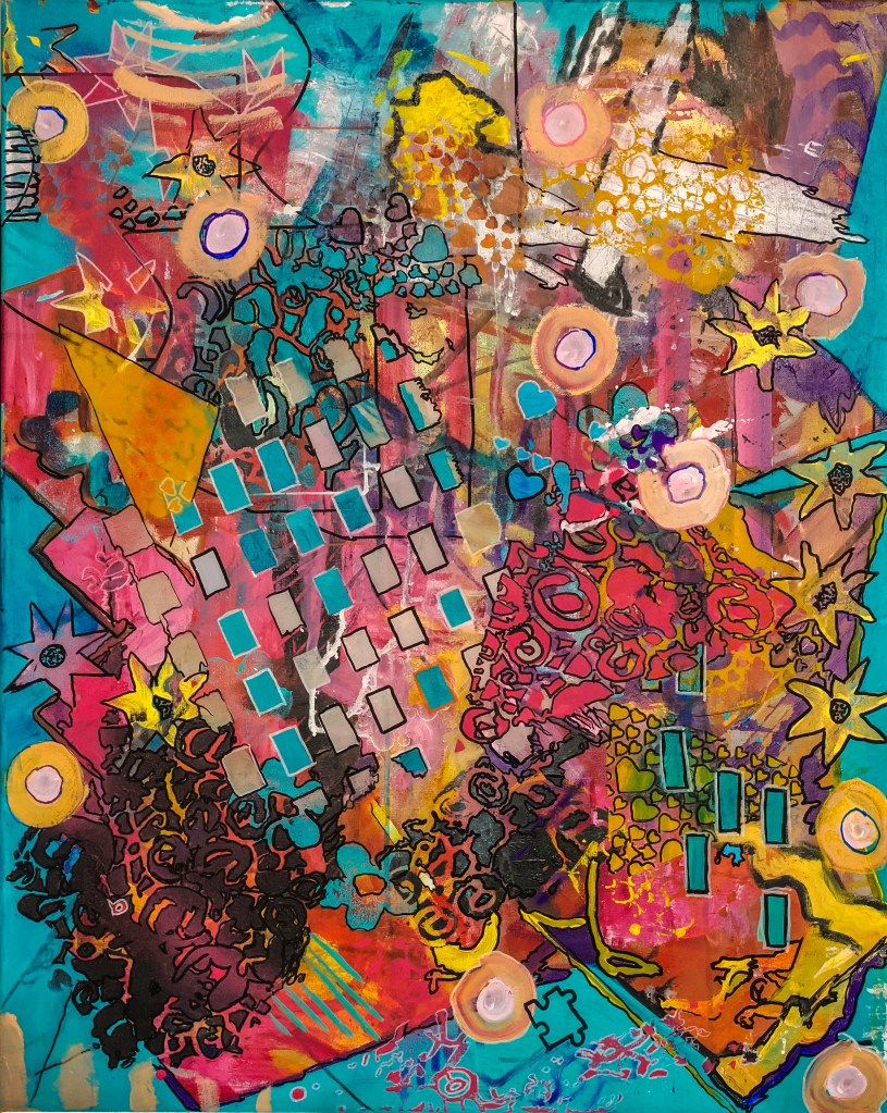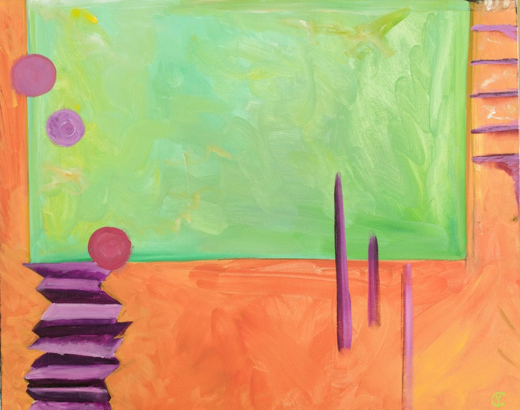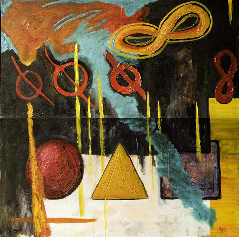 According to the Tate Galleries England, “[a]bstract art is art that does not attempt to represent an accurate depiction of a visual reality but instead use shapes, colours, forms and gestural marks to achieve its effect.With Abstract art we move beyond knowledge towards new ways of imagining.”This collection offers symphonies of colours; tone poems of images; quirky juxtapositions of forms, colours & techniques. All are intended to evoke pleasure in form, colour, ideas. [All works acrylic on canvas unless otherwise noted.]