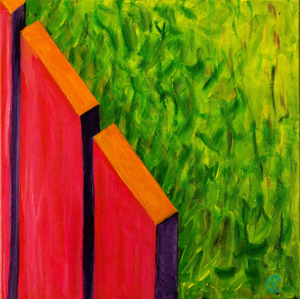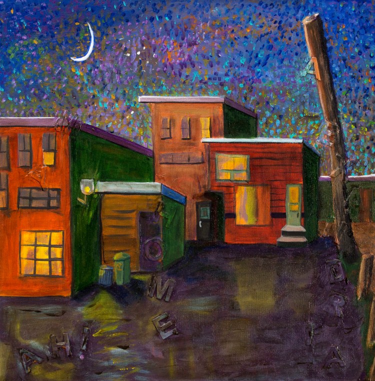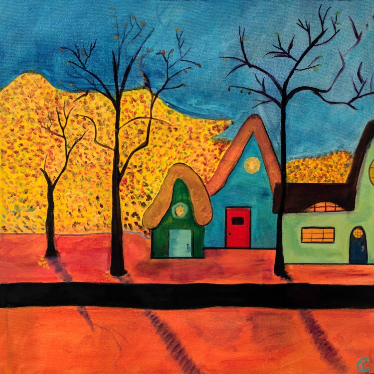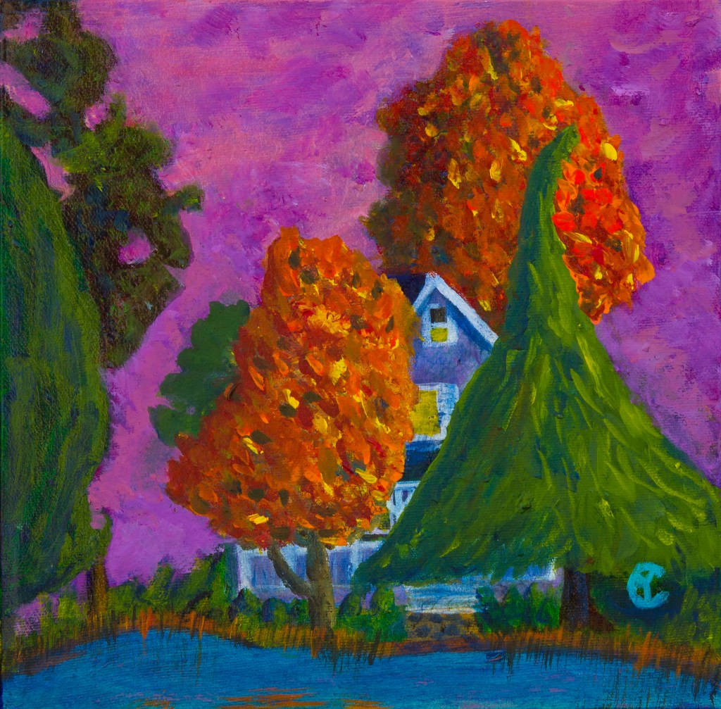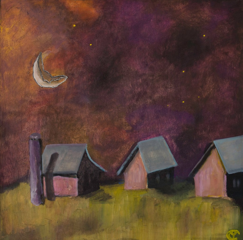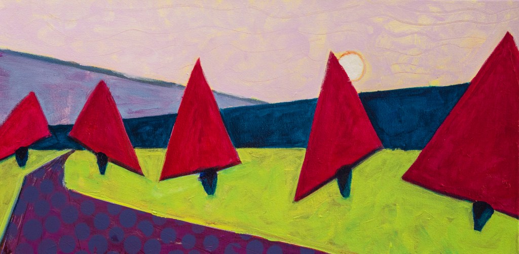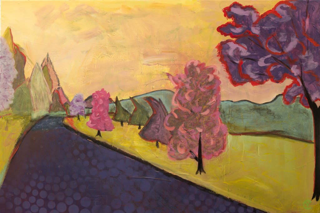 Traditionally, scapes refer to landscapes, depictions of the geographical world around the artist. Currently that view is expanded to include other views including tablescapes and mindscapes. [All works acrylic on canvas unless otherwise noted.]