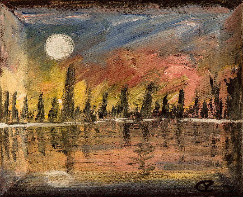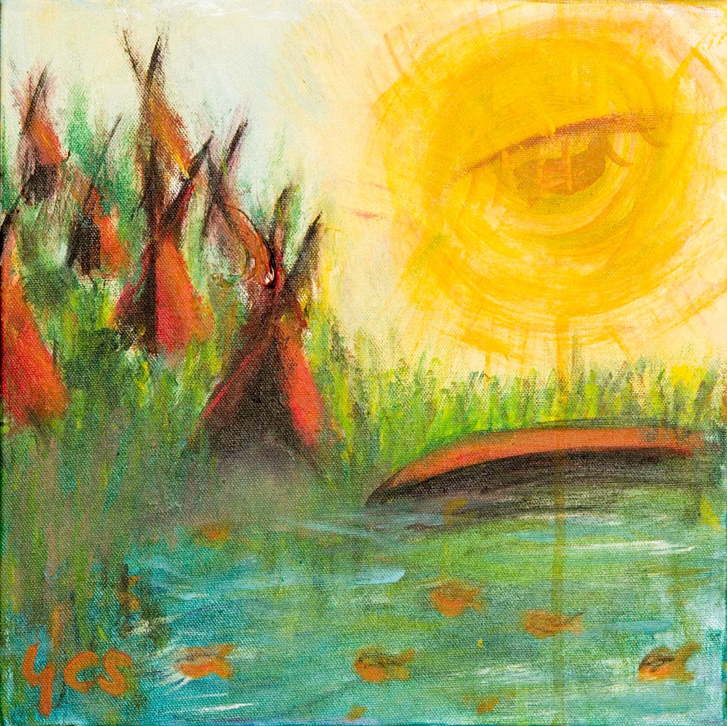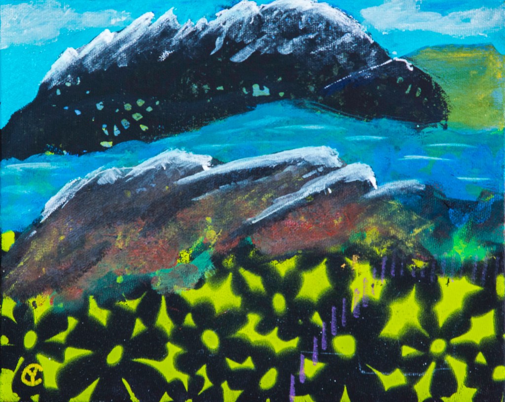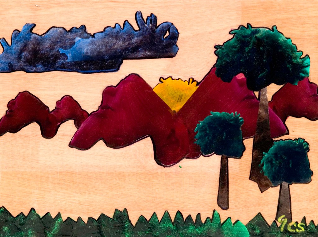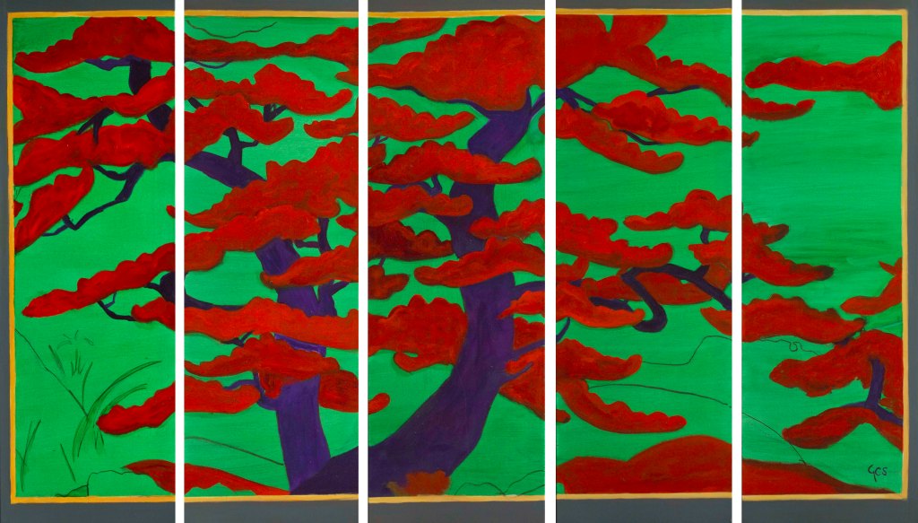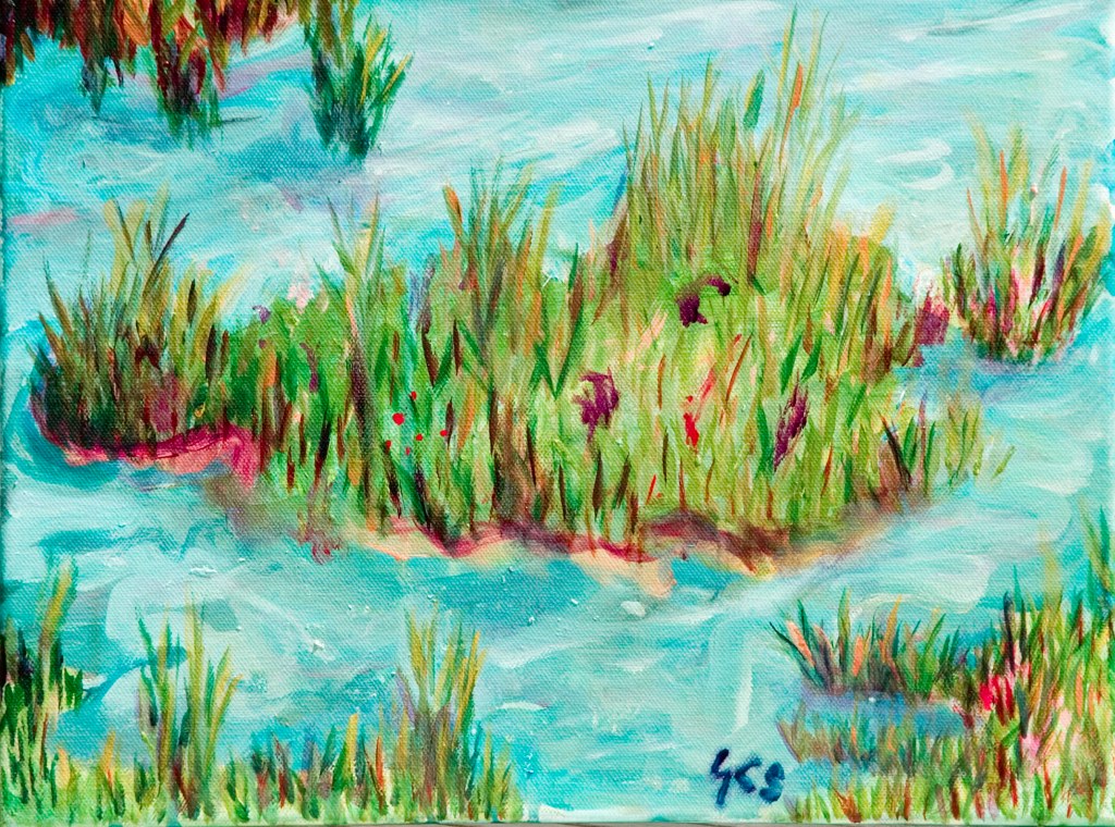 Traditionally, scapes refer to landscapes, depictions of the geographical world around the artist. Currently that view is expanded to include other views including tablescapes and mindscapes. [All works acrylic on canvas unless otherwise noted.]