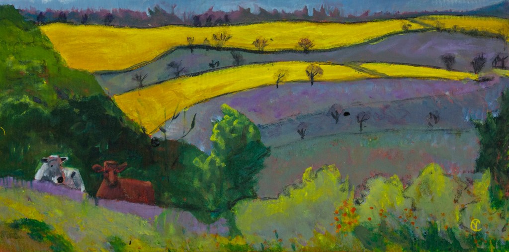 I had the image in mind, chose the colours and went at her! It was frightening, exhilarating and . . . effective! I didn’t have time to worry about the believability of the cows or how the light hit the fields.
