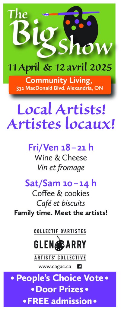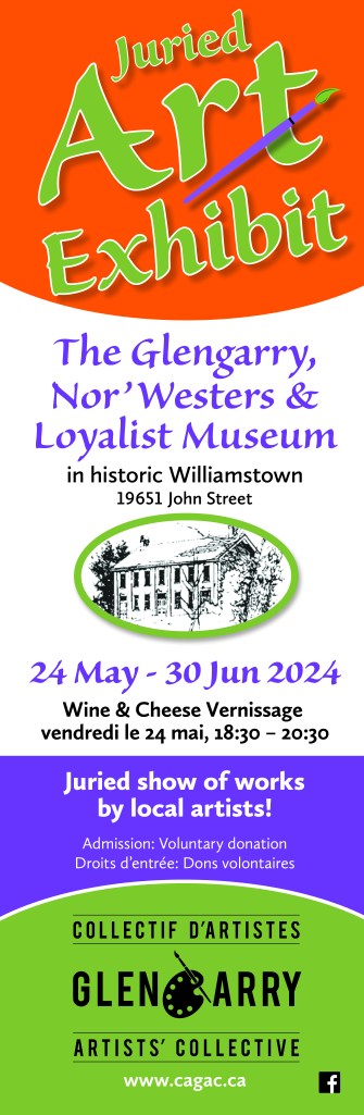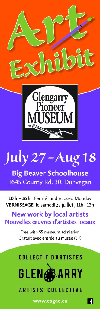 This year 27 local artists exhibit 57 works in the Big Beaver Schoolhouse of the Glengarry Pioneer Museum. The vernissage occurs Saturday 27 July from 11:00-13:00. All are welcome to meet the artists, view the works & have refreshments. (Coincides with an art activity by the museum.)